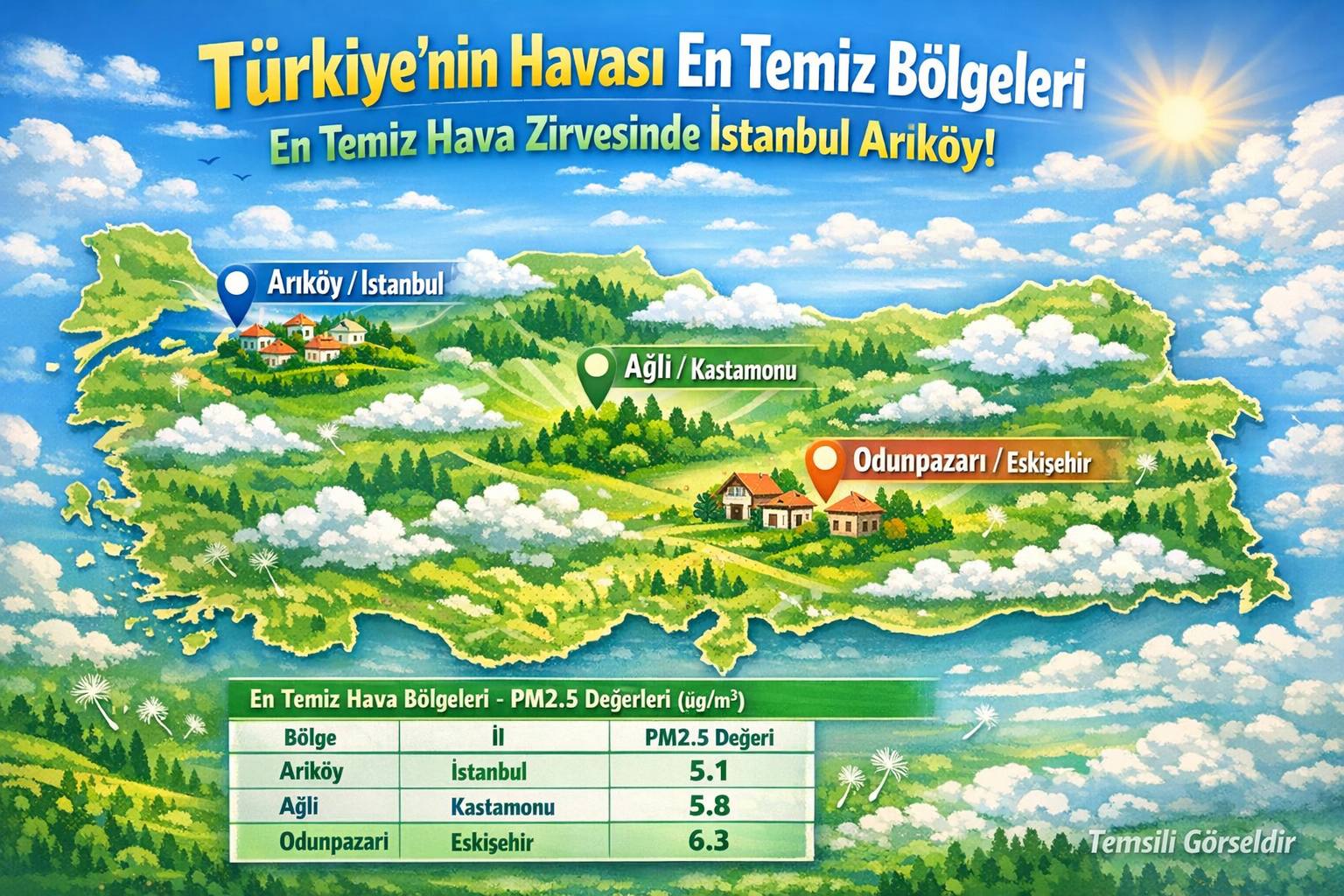 2025 Dünya Hava Kalitesi Raporu verilerine göre Türkiye’nin havası en temiz bölgeleri belirlendi. Listede İstanbul’dan Kastamonu’ya, Eskişehir’den Ankara’ya kadar yeşil ve düşük PM2.5 değerleriyle dikkat çeken yerler öne çıkıyor.