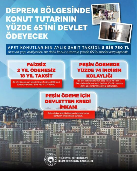 Depremzedelerin ekonomik yükünü hafifletmek amacıyla devlet, konutların altyapı dahil bedelinin yüzde 65’ini karşılayacak. Bu sayede vatandaşlar daha uygun şartlarla ev sahibi olabilecekler. Erdoğan’ın açıklaması, uzun vadeli, sabit ve düşük ödemeli bir model sunarak depremzedelerin yaşamlarını stabilize etmeyi amaçlıyor.