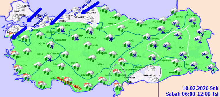 Meteoroloji Genel Müdürlüğü tarafından Tüm yurdumuzun 10 Şubat 2026 Salı gününe ait hava tahmin raporu açıklandı.