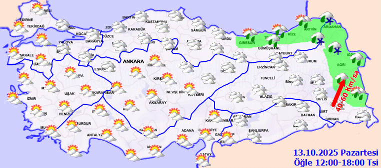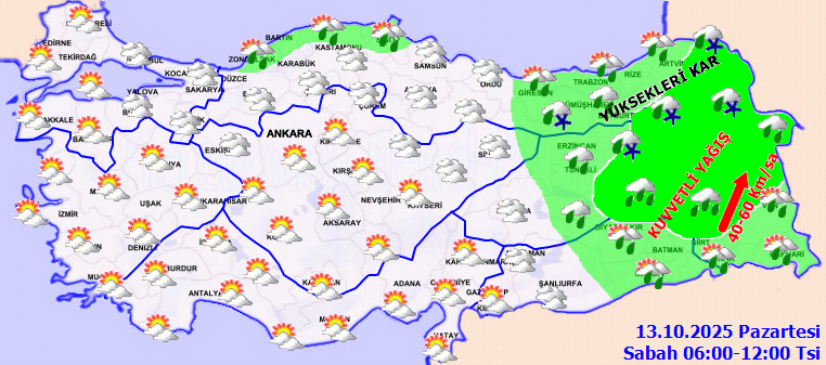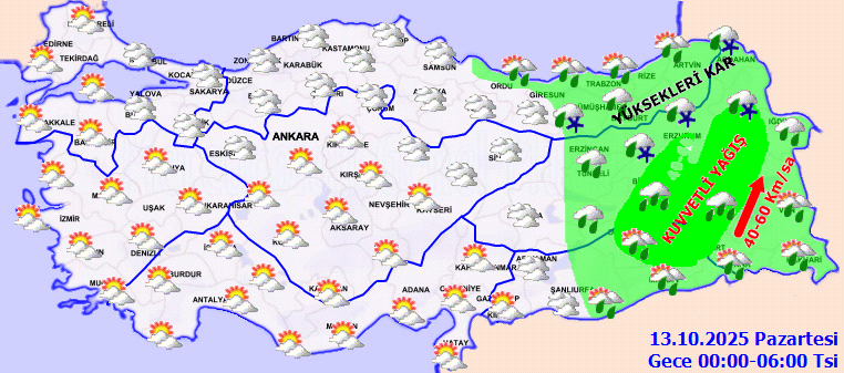 Meteoroloji Genel Müdürlüğü tarafından Tüm yurdumuzun 13 Ekim 2025 Pazartesi gününe ait hava tahmin raporu açıklandı.