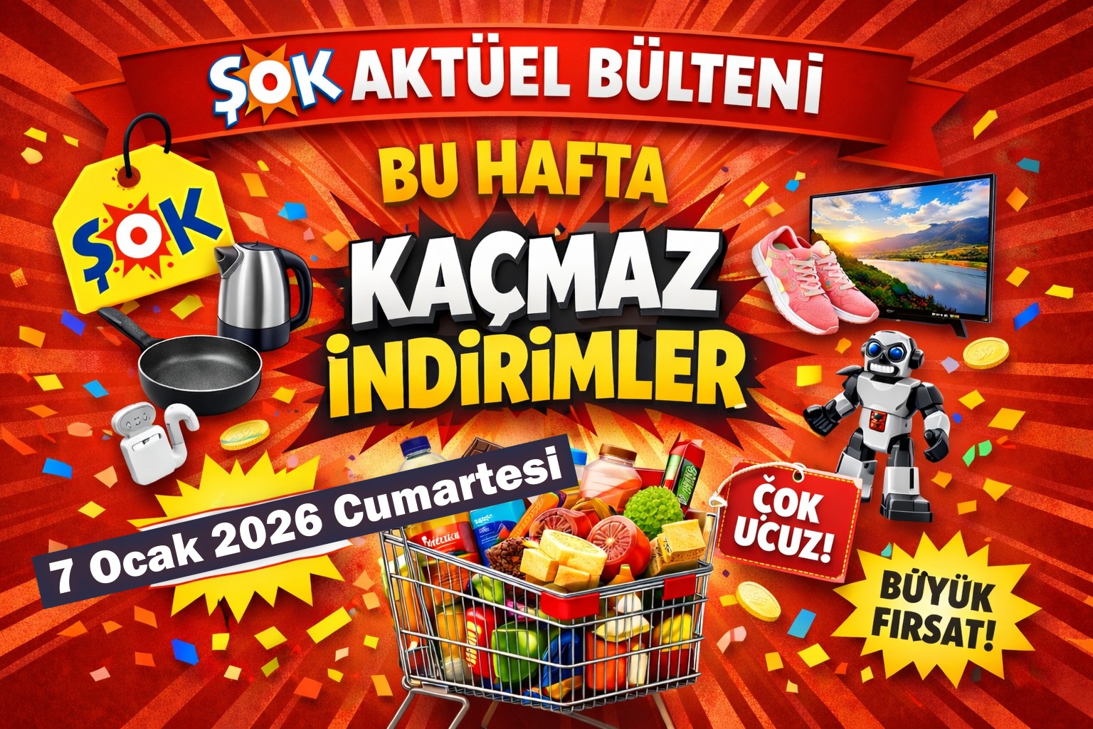 7 Ocak 2026 Cumartesi tarihli Aktüel Ürünler Kataloğu ile ŞUBAT ayı haftalık kampanyalarına hız kesmeden devam ediyor. ŞOK Haftanın Önerileri etiketi ile hazırladığı ve büyük indirimler ve kampanyalarla CUMARTESİ Gününden itibaren sizlerin tercihine sunacak